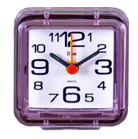 Настольный будильник Рубин в квадратном прозрачном корпусе. Питание от батарейки типа АА х 1 шт. Размеры: 7х7х4 см.