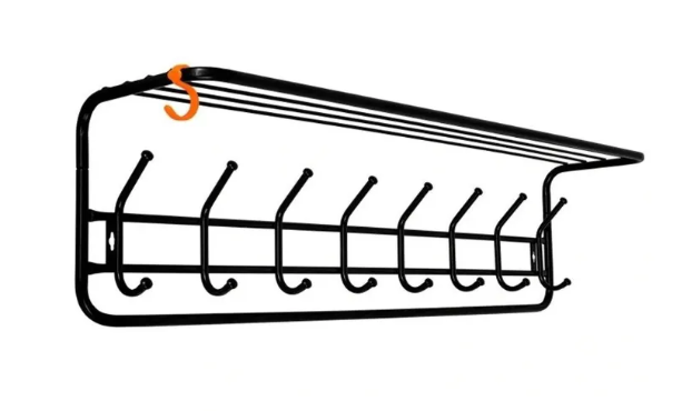 - конструкция изделия состоит из 8 крючков и полки под головные уборы.