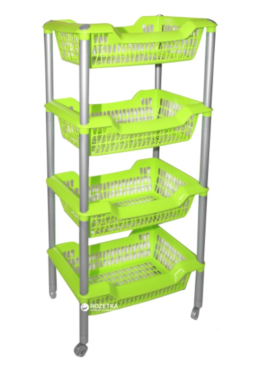 Этажерка с корзинами отлично подойдет для хранения овощей и фруктов, средств гигиены, бытовой химии и других предметов. Это отличное решение для малогабаритной квартиры - поможет быстро разместить необходимые вещи в ванной, прихожей или детской. Для удобного перемещения по комнате этажерка снабжена колесами. Пластик хорошо переносит влажность. Ухаживать за ним также легко - очистить поверхность можно при помощи обычных моющих средств без применения абразивных материалов. Рекомендуемая общая нагрузка на этажерку до 8 кг. Размер этажерки в собранном виде составляет 440x304x896 мм.
