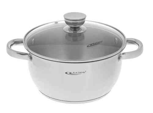 Кастрюля из нержавеющей стали Катунь КТ05-D-18 Антея. Объем 5.0 литра. Диаметр 24 см. Крышка стеклянная G-типа, с пароотводом, прозрачная. Ручки прикреплены методом клепачной фиксации.. Форма корпуса -коническая, наружняя полировка - зеркальная, внутри матовая.Толщина стенок 0,5 мм. Дно капсульое: алюминий + нержавеющая сталь. Марка стали 201.