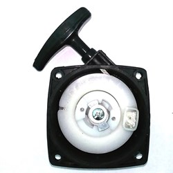 Ручной стартер для триммера T40-3 представляет собой устройство размером с 86х86х3мм, с расстоянием между крепежными отверстиями 68мм - по горизонтали, и 96мм - по оси. Корпус изделия изготовлен из пластика, а храповик - из пластика и металлического уса.