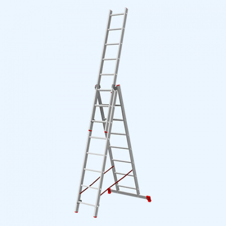Трехсекционная лестница Новая Высота 3х8 ступеней 1230308 представляет собой три соединенные секции и в зависимости от их расположения используется как стремянка, стремянка с выдвинутой секцией, приставная односекционная, приставная выдвижная лестница.