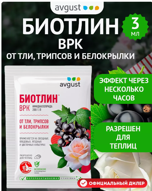 Средство от тли на всех культурах Биотлин ВРК, ампула 3 мл. Системный препарат для уничтожения различных видов тли на плодовых, ягодных, овощных и цветочных культурах. ПРЕИМУЩЕСТВА: Средство о тли эффективно против насекомых, скрытоживущих и питающихся на нижней стороне листа. Обладает высокой скоростью воздействия - эффект от обработки наблюдается уже через несколько часов. Не вызывает привыкания у вредителей. Биотлин – один из новейших препаратов против тли, а также других сосущих вредителей: белокрылки, яблонного цветоеда, цикадок, трипсов на огурцах, томатах и цветах, яблоне и смородине. Биотлин обладает системной активностью. То есть, проникая во все части растения, препарат воздействует на насекомых как при контакте с их внешними оболочками, так и при попадании в кишечный тракт, когда вредители питаются соками культур. Взрослые насекомые и личинки разных возрастов погибают в течение нескольких часов после обработки, и далее защитное действие сохраняется от 14 до 21 суток (на разных культурах и для разных вредителей по-разному). Таким образом, в течение 2-3 недель ваши растения защищены от насекомых, которые могут отродиться из яйцекладок, переместиться с соседних участков или с ваших необработанных культур. СПОСОБ ПРИМЕНЕНИЯ: Применять Биотлин нужно согласно инструкции. Как и любой другой инсектицид, приготовление рабочего раствора производится путём разведения концентрата сначала в небольшом количестве воды (до 1 литра), а затем добавления воды до необходимого количества. Рабочий раствор хранению не подлежит, то есть использовать его нужно сразу. Опрыскивание проводится по листьям и стеблям в безветренную погоду, желательно в утренние (до 10:00) и вечерние (после 18:00) часы – чтобы избежать солнечных ожогов на растениях.