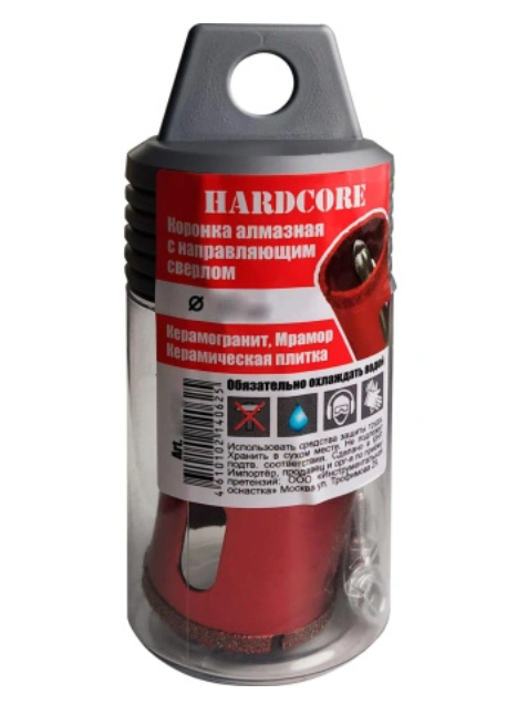 Коронка алмазная Hardcore применяется для сверления керамогранита, керамической плитки, мрамора и камня. Сверление необходимо проводить в безударном режиме с водяным охлаждением коронки и места сверления на плитке.