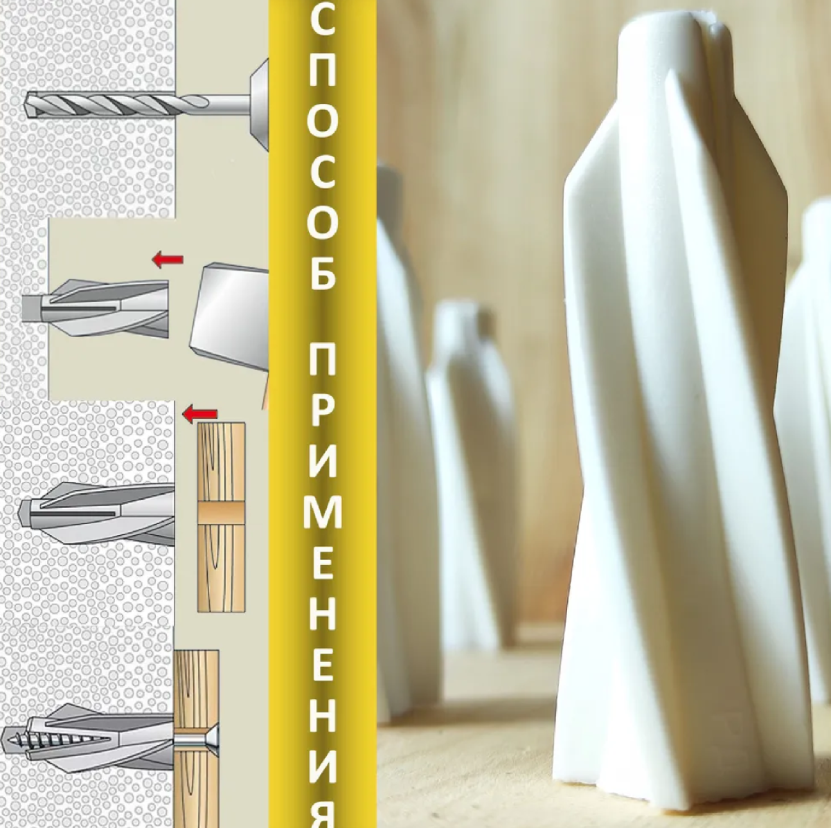 Дюбели предназначены для крепления различных изделий к пенобетону (пористому бетону). Дюбель винтовой имеет высокие внешние ребра, которые позволяют значительно увеличить площадь соприкосновения с материалом. При распирании дюбеля шурупом обеспечивается его надежное закрепление в пенобетоне