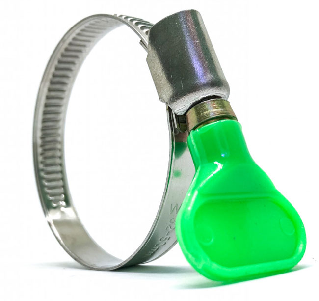 Хомут с ключом он же хомут с бабочкой или хомут с ручкой выпускаются для использования в быту там где нужно часто снимать и ставить хомут. Вместе с тем ключом легко может быть создана нагрузка, превышающая рекомендованный момент затяжки. Поэтому для серьезных применений мы рекомендуем пользоваться червячными хомутами без ключа и отверткой для червячных хомутов.
