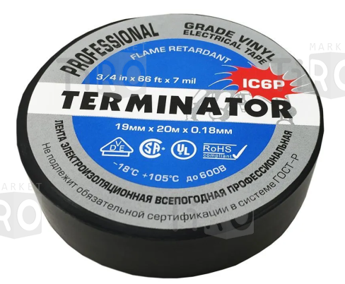 Изолента Terminator IC6P черная, огнеупорная, всепогодная 0,18мм*19мм*20м. 10шт