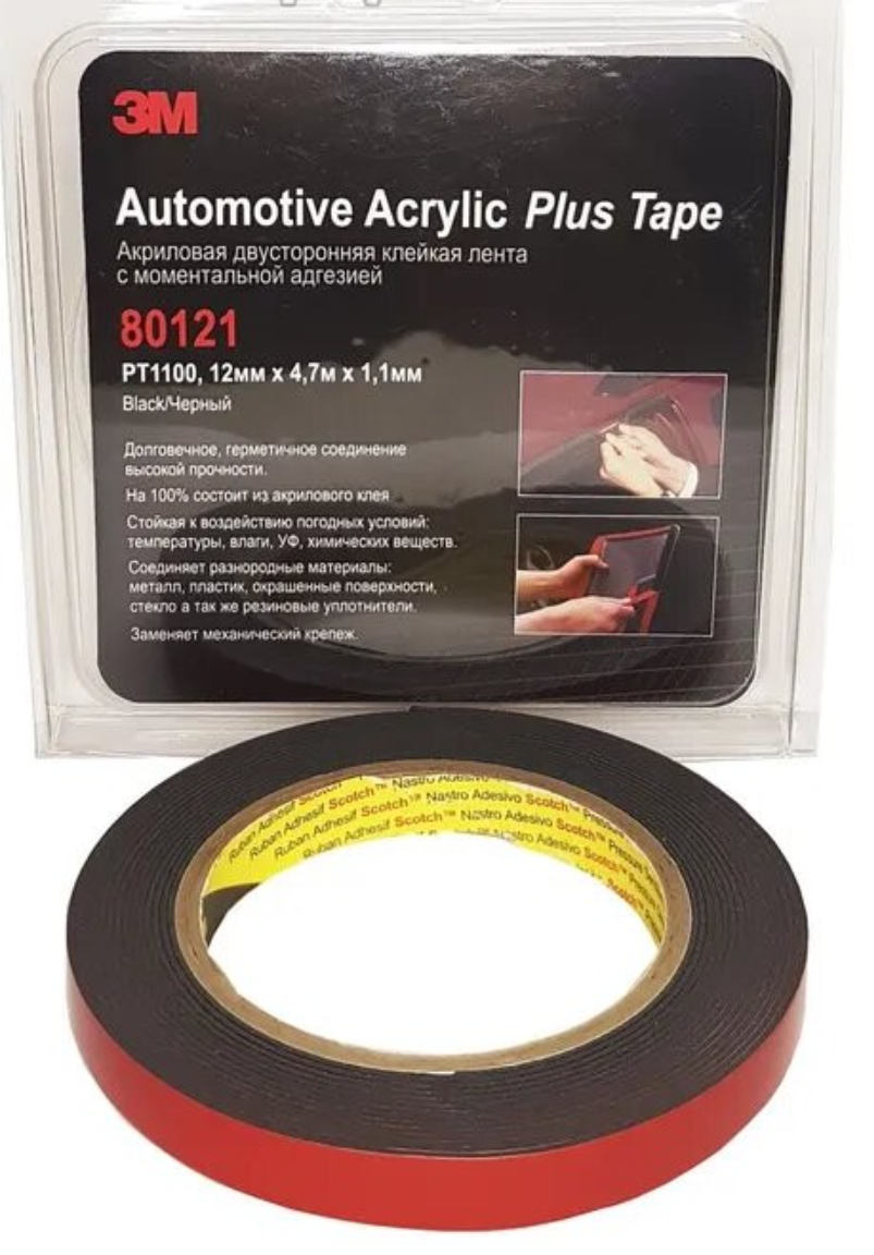 Двусторонняя клейкая акриловая лента PT 1100 компании 3M представляет собой ленту черного цвета из вспененного акрилового клея, с обеих сторон на которую нанесен специальный акриловый адгезив. Лента PT 1100 предназначена для крепления к кузовам автомобилей (в рекомендациях по применению - монтажная поверхность) деталей экстерьера, таких как молдинги, вставки и др. (в рекомендациях по применению - изделие).