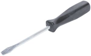 Отвертка плоская. Используется для слесарно-монтажных работ. Стержень закален. Анатомическая пластиковая рукоятка. Материал стержня – хром-ванадиевая сталь. Покрытие – цинк.