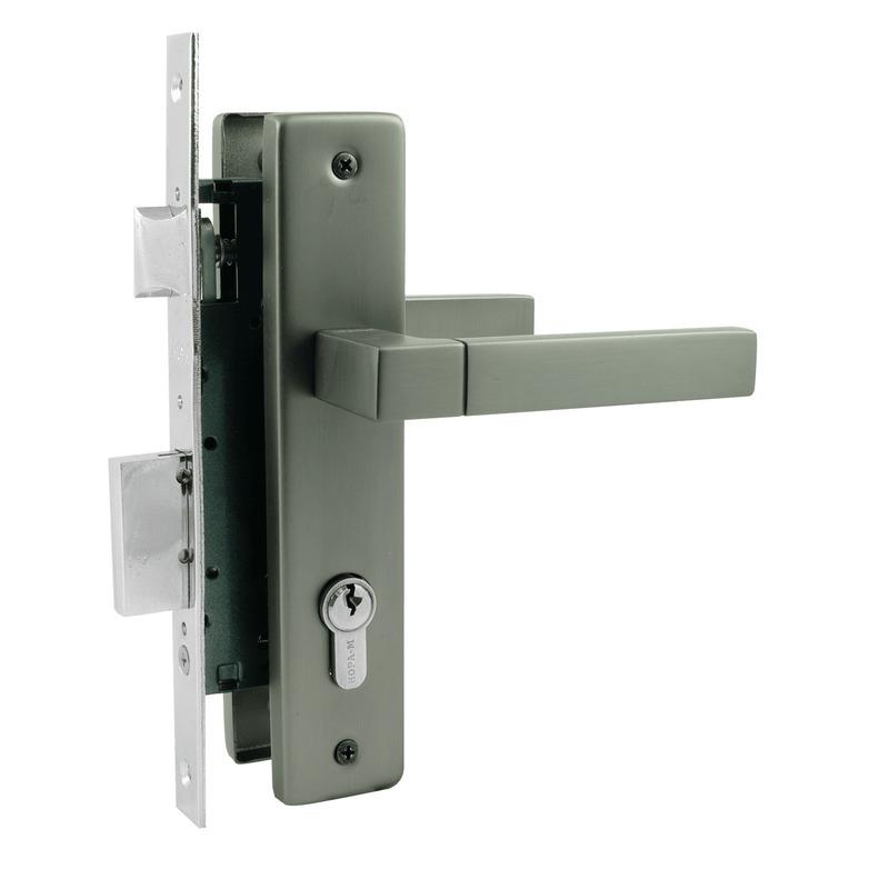 Комплект состоит из: ручек на планке (2 шт.), корпуса замка (1 шт.), цилиндрового механизма (1 шт), ключей (5 шт), ответной планки (1 шт.). Также в комплекте идёт крепеж для установки корпуса, ручек на планке и цилиндра.