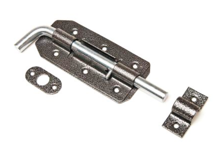 Засов накладной для деревянных и металлических дверей. Материал - сталь, полимерное покрытие. Габариты корпуса - 150х65 мм, 6 крепежных отверстий. Г-образный цилиндрический ригель диаметром 13 мм, вылет - 40 мм. В комплекте 2 ответные планки - накладная и торцевая.