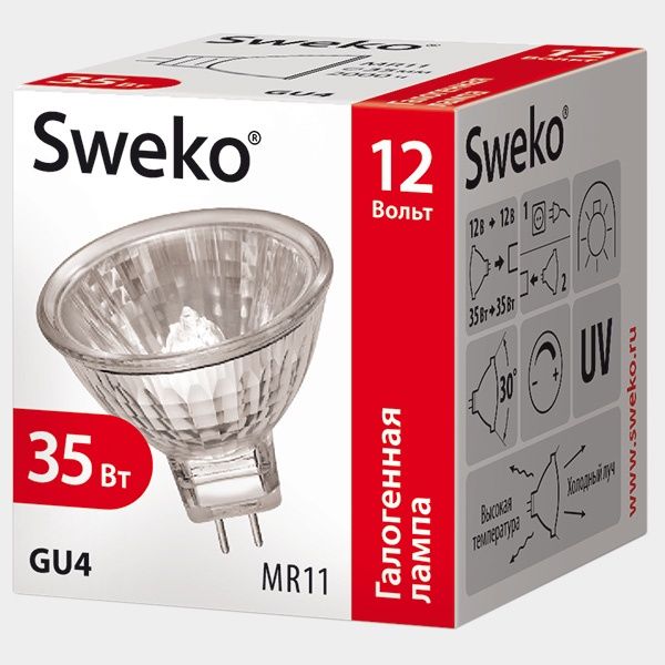 Галогенная лампа SHL-MR11 с цоколем GU4 от торговой марки Sweko представляет собой рефлекторную лампу со светоотражателем и флуоресцентным покрытием MR11 в форме софита и предназначена для обеспечения общего и декоративного освещения помещений, где используются точечные светильники со штырьковым цоколем GU4, применяемые в системах натяжных и подвесных потолков, а также идеально подходят для декоративной подсветки витрин, мебели и торгового оборудования. Данная лампа мощностью 35Вт рассчитана на рабочее напряжение 12В. Бытовая лампа MR11 изготовлена из стекла, дихроичный светоотражатель выполнен в специальной рифленой форме для лучшего расcеивания светового пучка с углом в 30 градусов и закрыт защитным стеклом, она поддерживает функцию диммирования и не требует специальной утилизации.